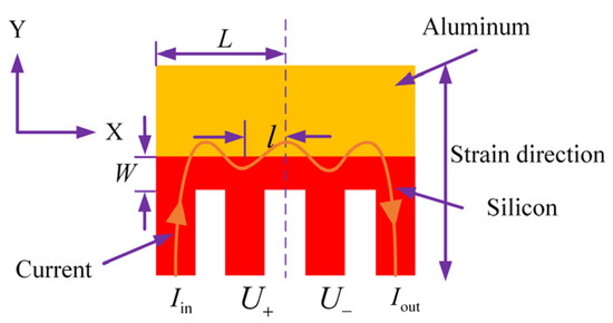 The aluminum–silicon hybrid structure is a metal–semiconductor hybrid structure, and its working principle and measurement method are different from those of traditional silicon piezoresistive sensors. Figure 1 shows a schematic diagram of the aluminum–silicon hybrid structure. It mainly includes a silicon piezoresistive strip and an aluminum shunt, which are conjoint with ohmic contact. After uniaxial stretching is applied, the tensile strains along the width of the hybrid structure can deflect the current away from the aluminum shunt on account of this stress-induced anisotropy in the silicon conductivity [19,20,21]. From the perspective of macroscopic performance, the resistance is significantly increased, which can be used to achieve pressure measurement. This is an overall effect, and the piezoresistance enhancement has nothing to do with the change in the contact area between silicon and aluminum due to stress.
