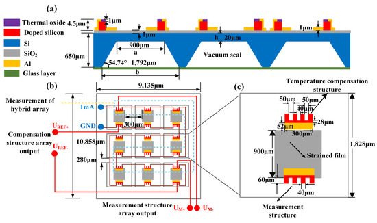 It can be seen from Figure 2 that the strained film is located in the center of each sensing unit, and the aluminum–silicon hybrid structure used for measurement is located at the edge of the strained film. The aluminum–silicon hybrid structure for temperature compensation is outside the strained membrane. When the doping concentration and manufacturing process are consistent, the resistance values of the two equivalent aluminum–silicon hybrid structures are equal. When the temperature is constant, there is no external pressure, and the constant current source is used for the power supply, the output is U0. When the temperature changes, temperature drift changes of the two equivalent aluminum–silicon hybrid structures are both , and the output voltage is . When an external pressure P acts on the strained film, the output voltage of the equivalent hybrid structure used for measurement is , and the output voltage of the equivalent hybrid structure for temperature compensation is still . The difference U between and is . In this way, temperature-induced output change can theoretically be eliminated.