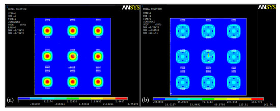 Simulation diagram of aluminum–silicon hybrid array: (a) displacement cloud; (b) stress distribution cloud.