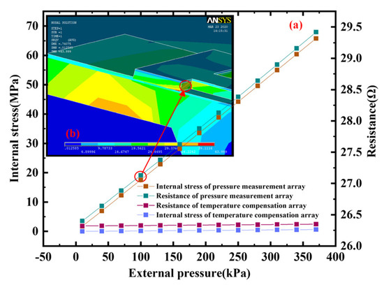 In order to calculate and analyze the sensitivity of the array-type sensor, we change the pressure to obtain the stress distribution of the aluminum–silicon hybrid structure unit. Then, we derive the stress and pressure data and draw the relationship curve between internal stress and external pressure, as shown in Figure 4a. It can be seen from the figure that when the external pressure increases in the range of 0~370 kPa, the internal stress of the measurement structure increases linearly and reaches the MPa level. However, almost no stress is generated inside the temperature compensation structure. Substituting the obtained stress data into Equation (1), the hybrid transfer resistance of the aluminum–silicon hybrid structure array corresponding to the stress can be obtained. The calculation parameters include the following: the stress-free resistivity is 0.0435 Ω∙cm, the piezoresistance coefficient is 66.5 × 10−11 Pa−1, the effective silicon thickness is 1 μm, and the width is 28 μm. In addition, the L and l of the equivalent hybrid structure of the measurement array are 1350 μm and 1260 μm, respectively. After calculation, the relationship between the transfer resistance of the array and the external pressure is obtained, as shown in Figure 4a. The initial resistance of the array-type pressure sensor designed in this paper is 26.4 Ω. As the pressure continues to increase, its transfer resistance shows a linear increasing trend. According to the sensitivity Formula (4), the theoretical sensitivity of the array-type sensor can be calculated to be about 0.318 mV/(V·KPa).