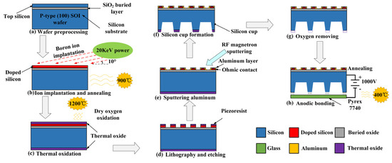 Step(h): anodic bonding. The wafer was bonded to a 300 μm thick borosilicate glass substrate (Pyrex 7740) by using anodic bonding technology under the vacuum conditions of 400 °C temperature and 1000 V forward voltage.