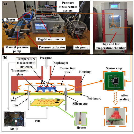 In order to measure the static characteristics of the pressure sensor chip, an experimental measurement platform was built. The experimental instrument was composed of a Fluke PPC-4 air pressure generator (Fluke Corporation, Everett Reed, WA, USA), a const162 desktop air pump (ConST Instruments Technology Inc., Beijing, China), an Agilent 34410A digital multimeter (Agilent Technologies, Inc., Santa Clara, CA, USA), a high- and low-temperature Test box (Cliphyco Instruments Co., Limited, Hong Kong, China), and an upper computer (Lenovo Group Limited, Beijing, China). The physical map is shown in Figure 7a. The temperature hardware compensation structure only compensates for the chip itself. We also need to compensate for the ambient temperature. With this in mind, our approach is to feed back the temperature signal measured by the temperature compensation array to the microcontroller unit (MCU) and then control the heating system to work through the PID algorithm so that the array sensor works at a stable ambient temperature. The heating power device is a polyimide heating diaphragm. The schematic diagram of the thermodynamic control system is displayed in Figure 7b.
