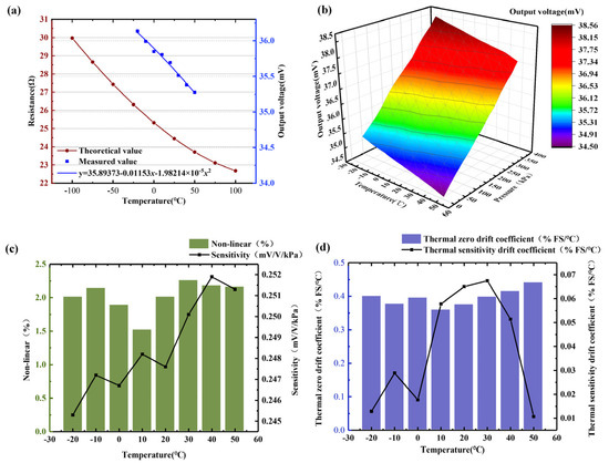 The relationship between sensor output and temperature: (a) the theoretical output value and the actual measured value of the temperature compensation structure; (b) output value under different temperatures and pressures; (c) sensitivity and nonlinear error at different temperatures; (d) thermal zero drift coefficient and thermal sensitivity drift coefficient at different temperatures.