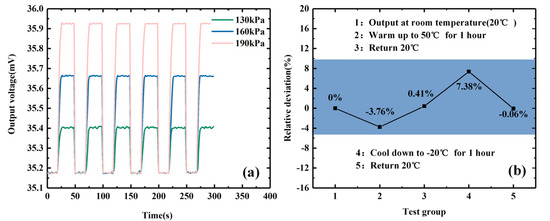 Stability test: (a) repeated testing of output under different external pressures; (b) relative error test of the output voltage of the sensor under rising and falling temperatures.