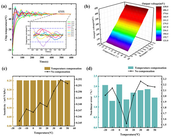 The relationship between sensor output and temperature after temperature compensation: (a) temperature change curve with time after temperature compensation; (b) pressure output curve after hardware temperature compensation structure and constant temperature system compensation; (c) comparison of sensor sensitivity after temperature compensation and sensor sensitivity without temperature compensation; (d) comparison of nonlinear error after temperature compensation and nonlinear error without temperature compensation.