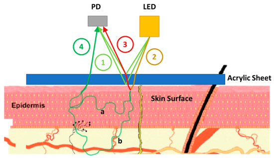 Since there is no partition between the LED and PD, and there is an acrylic sheet, the intrinsic reflection of ① in Figure 1 contributes to the received signal. We denote this intrinsic component as . ② in Figure 1 shows the light rays passing through an acrylic sheet and reaching the skin (e.g., the wrist). In the figure, the escaped light rays ② interact with the skin surface and two events occur. One is the direct reflection from the surface, ③ in the figure. This can be defined as the extrinsic reflection component of the received signal. We denote this component as . The other part ④ in the figure is the expected part of the light rays, which travels through the skin and interacts with the blood and non-blood components according to the theoretical model. Both scattering paths ‘a’ and ‘b’ are the paths where melanin can interact with the light intensity. However, only path ‘b’ interacts with blood components in the skin.