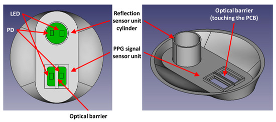 Next, we propose a method to remove the skin effect from the signal ④ (or . At this stage, we only have to find the source of the signal that can indicate the amount of melanin and bilirubin in the skin layer. The signal can then be used to inversely model the melanin and bilirubin levels again. Here, to make the skin reflection value satisfy our condition, we adopt an additional cylindrical sensor (reflection sensor) in addition to the PPG sensor, and the detailed configuration can be seen in Figure 2. Note that the optical barrier touches the PCB from the inside and it also touches the skin surface from the outside. The optical barrier is only given in the PPG sensor unit. The reflection sensor unit does not contain any barrier. The PPG sensor unit may have an acrylic sheet on top of it. However, the acrylic sheet should not cover the barrier, and the sheet must be separated by the optical barrier. The optical barrier must be in contact with the skin. An acrylic sheet is not used in the reflection sensor unit.