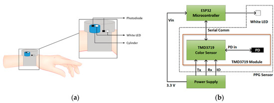 (a) LED and PD arrangement in the device and (b) block diagram of device components [11].