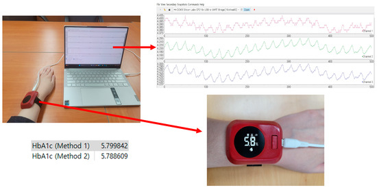 In the context of methodology, we utilized the same reference equipment as in our previous study [9]. To record the reference HbA1c and SpO2 values, we used BioHermes A1c EZ and Schiller Argus OXM Plus devices, respectively. The study process also included the recording of 2 min PPG signals. Before recording, the subjects were told to remain silent and relaxed. Since methods to reduce the influence of motion artifacts are currently being studied and we expect to have the opportunity to present the results in the near future, measurements were made in this study with the wrist as still as possible. While recording, it was also ensured that all of the subjects were provided with a comfortable environment so that they could remain relaxed.