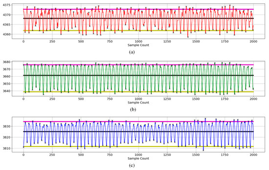 Peaks and valleys of a subject’s three-wavelength signal to determine AC and DC components (The black line represents the average value of the signal, the purple line represents the average value of the peaks, and the yellow line represents the average value of the valleys.): (a) red wavelength, (b) green wavelength, and (c) blue wavelength.