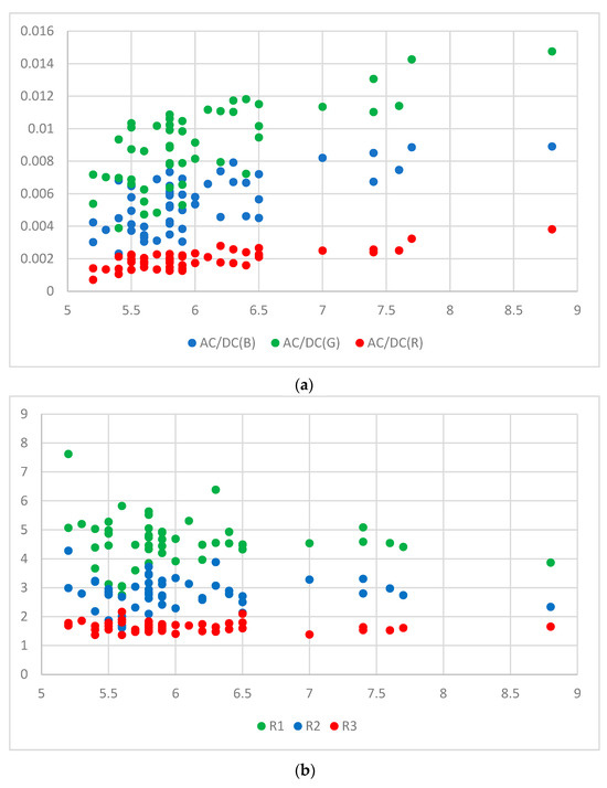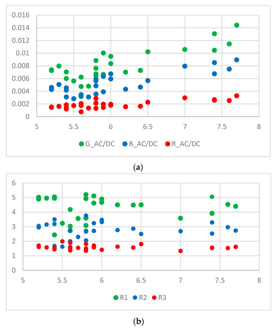 The AC to DC ratio (AC/DC) represents the ratio of the pulsatile (i.e., AC) to the baseline or static (i.e., DC) component of the PPG signal. There could be an underlying relation between the AC/DC value and HbA1c. However, there are few studies on this issue. One study demonstrated a proportional relationship between AC/DC value and glucose [12]. Another study showed a correlation between blood glucose levels and the AC/DC values of PPG signals [13]. Figure 6 shows AC/DC values versus HbA1c and ratio versus HbA1c for 28 subjects. In the case of the green wavelength, the AC/DC value is generally larger than those of the other two wavelengths (blue and red), and the results for all three wavelengths show a tendency to roughly increase according to the HbA1c value. This tendency of AC/DC is one of the reasons for using AC/DC values as input for calibration. We may consider ratios (R1, R2, and R3) of different AC/DC values of the PPG signal as input for calibration. R1 was considered as the ratio of the green AC/DC to red AC/DC, R2 was considered as a ratio of the blue AC/DC to the red AC/DC, and R3 was considered as a ratio of green AC/DC to the blue AC/DC. These are expressed in Equations (8)–(10). The ratio does not show the same clear tendency as AC/DC. The reason is that each AC/DC used at a different ratio shows a similar tendency. However, since each R-value contains information on two AC/DCs, it can be used as valid information.