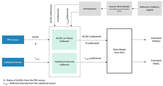 Two calibration models were used for calibrating AC/DCs (or ratio values) and three cylindrical signals (blue, green, and red) with the corresponding values obtained from the inverse wrist model. The target values for the calibration model were found through interpolation using the reference HbA1c and SpO2 values for each subject. For calibration, the XGBoost regression model was used for both the AC/DC (or ratio) calibrator and the cylindrical value calibrator. After calibration, the calibrated output values were aligned to the MCS table. These calibrated values were then easily interpolated with the wrist model to find the results. Estimated HbA1c and SpO2 values were then found for each subject. Every step of calibration and final estimation was observed and validated in a systematic way.