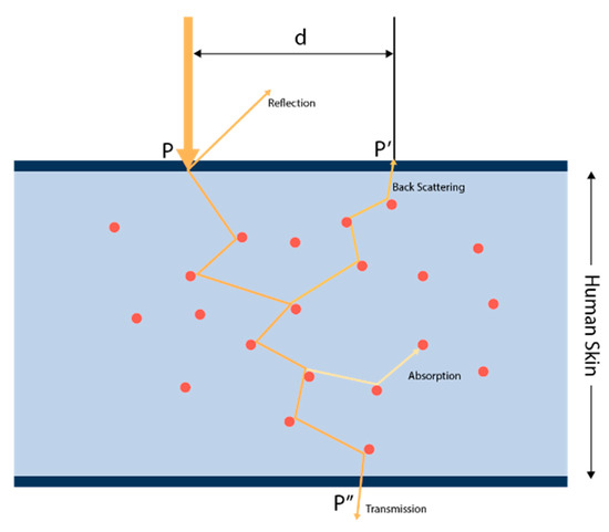 The HbA1c detection mechanism begins with using PPG signals to exploit the difference in light absorption rates with changes in HbA1c in the blood of the microvascular layer of tissue. In this study, we used Monte Carlo simulation to estimate HbA1c noninvasively. First, each layer (skin, muscle, fat, bone, blood, etc.) is identified through 3D MRI images. Here, the light absorption and scattering coefficients for each layer are calculated and applied according to changes in HbA1c, SpO2, and melanin values. We simulated the path, absorption, and scattering of the virtual photons projected onto a 3D biometric model that closely resembles reality. In this method, a number of photons are simulated through a biological/turbid media, and the received photon weights and traversing paths are recorded. To run a simulation, three elements are required: at least one source, at least one detector, and one model. The source has a position, direction, and type in the 3D space. Common types are isotropic and pencil. The detector only has a position in the 3D space. The model can be constructed by using parametric methods, voxels, meshes, etc. The mesh model contains the following properties: material–absorption coefficient (μa), scattering coefficient (μs), anisotropy factor (g), and refractive index (η). The photons will traverse through the model and then be reflected on the incident surface, where they are transmitted, absorbed, scattered, and diffusely reflected, as shown in Figure 8. In the figure, at the upper boundary of the depicted skin layer, a beam of light originates from a source external to the system. This is denoted by point P, where the light first makes contact with the skin surface. Upon this initial interaction, part of the light is reflected off the surface. As it penetrates the skin, some photons are scattered back toward the surface. This backscattering is represented by the paths that loop back up toward the point marked P′. The distance marked ‘d’ represents the distance between the incident light, P, and the photodetector, P′. As the light travels deeper into the skin, it encounters various tissue elements, symbolized by the red dots. These random tissue elements represent simplified models of the complex structures within the skin, such as cells or blood vessels. These elements absorb some of the light energy, reducing the number of photons that continue to propagate through the skin. After multiple interactions with tissue elements, including absorption and scattering, the remaining light photons reach the lower boundary of the skin. The light transmission is marked by point P″, indicating the exit of light from the skin layer. The light that is backscattered to the surface and reaches point P′ can be detected by a photodetector placed at this position. This detection can provide valuable information about the properties of the skin and the effects of light interaction.