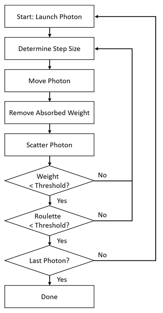The power of MCS lies in its flexibility. After setting up the source(s), detector(s), and model, the simulation process emits one photon at a time and interacts with the model. Figure 9 shows how this simulation works. First, a photon is generated from the position of the source with a random direction with a predefined distribution. Initially, the photon weight is set as 1. The step size is related to the total extinction (absorption) coefficient of the medium. Then, the photon is moved to the direction with the calculated step. The absorbed weight is then calculated, and its value is removed from the photon. This is the application of the absorption coefficient of the medium. The new direction of the photon is calculated using the scattering coefficient of the medium. Next, the photon is checked for the weight threshold, the roulette threshold. The roulette is performed to conserve the total energy of the system. If a photon exceeds the weight and roulette thresholds, the photon is again traversed from the “step size” stage. In this simulation, if any photon passes the region near the detector position, the photon ID and weight are recorded. If the last photon is simulated, the simulation stops. Figure 9 shows the Monte Carlo simulation flow chart. An examples of the MCS table can be found in Supplementary Table S1.