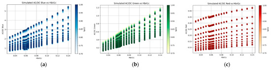 (a) Simulated AC/DC (blue) vs. HbA1c, (b) simulated AC/DC (green) vs. HbA1c, and (c) simulated AC/DC (red) vs. HbA1c with variable SpO2 values.