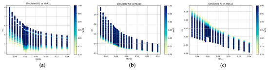 (a) Simulated R1 vs. HbA1c, (b) simulated R2 vs. HbA1c, and (c) simulated R3 vs. HbA1c with variable SpO2 values.