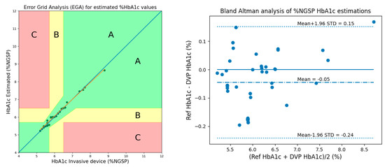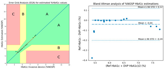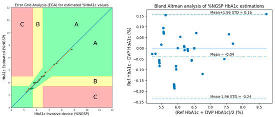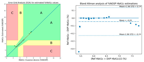 The performance of the proposed methods was evaluated using Clarke’s EGA and Bland–Altman analysis. Figure 16 shows the results of EGA and Bland–Altman analysis for HbA1c considering 3 AC/DCs and 3 cylindrical values in 50 subjects.