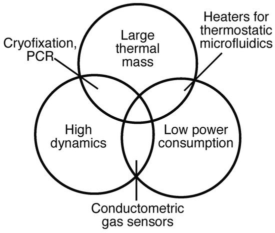Fast temperature changes of a thermal mass are used in a variety of microfluidic and microbiological applications. For example, rapid heating and cooling are needed to improve cycle time for polymerase chain reactions (PCRs) [18,19,20,21,22,23], droplet actuation using thermocapillary effects [24], or microfluidic actuation with microbubbles [25,26] or thermally expandable polymers [27]. The use of rapid temperature changes for the operation of thermal micromixers in microfluidic systems has also been proposed in the literature [28]. As illustrated in Figure 1, different applications require different trade-offs between the size, power consumption, and response time or rate.