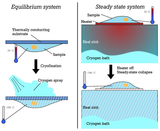 Two different principles for cryofixation with optical access have emerged. In an equilibrium system (left), the sample and the system are in a thermal equilibrium at room temperature until the cryofixation is started by spraying a cryogen on the substrate which rapidly cools the sample. A steady-state system (right) holds the sample at room temperature while a cryogen cools the backside of the system. This steady state collapses as soon as the heater is turned off and the sample is cryofixed.