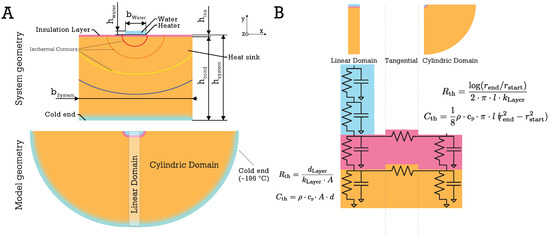 In addition to the semi-cylindrical domain, a linear domain is introduced to model the system with wider water channels (increase in ). Here, the water layer is no longer represented by a half-cylinder but through a rectangular domain defined by the width of the water channel and its height . The layers below are represented by their layer thickness and the width of the water channel. Both geometries are fused to a model using a lumped-element thermal equivalent circuit in the Cauer-type configuration. Each domain of each layer is modeled by a resistor and a capacitor (see Figure 4B). In each layer, a tangential resistor connects the domains. We implemented this model using ngspice and automated the model preparation, simulation, and data interpretation process in Julia [45]. The model parameters, material, and computational implementation are further described in Appendix C.