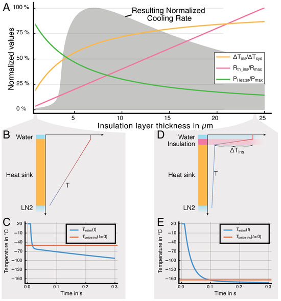 Introducing a thermal insulation layer below the heater reduces the temperature on top of the silicon layer, as the insulation layer now has a significant thermal gradient (D) and therefore reduces the temperature below the insulation layer while the heater is turned on (A). Accordingly, the insulation layer increases the cooling rate in the water channel, with the optimal height determined by a trade-off between temperature gradient and time constant. This is because the layers below store less energy before the cryofixation itself starts (and thus are able to conduct more energy away from the channel as soon as the heater is turned off) (A,C,E). The thermal resistance of the insulation layer will increase as the layer height increases. Consequently, the optimal insulation layer forms a compromise between a high temperature gradient in the insulation layer and the sufficiently short time constant of this layer. If there is no insulation layer, the temperature gradient is spread over the whole system, which reduces the cooling rate (B,C). The plots show the results of simulations using the domain model developed in this paper.