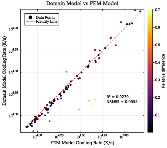 Correlation between calculated cooling rates of the domain model vs. the FEM model. An R-squared value of and a normalized root mean squared error (NRMSE) of 0.0555 indicate a good correlation between both models.