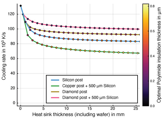The heat sink can be scaled in size without significantly reducing the available cooling rate in the water layer if the water channel width is significantly smaller than the overall system size. This is possible because the insulation layer below the heater prevents substantial heating of the underlying structures while the system is in its steady state with the sample at room temperature. As the thermal resistance of the heat sink increases, the power in the steady state must be reduced by increasing the thickness of the insulation layer. The best results for large specimen sizes will be reached with an intelligent choice of the materials in this setup. As shown in Figure 9, structures up to 50 μm should be able to reach a sufficient cooling rate using a diamond–silicon–polyimide system.