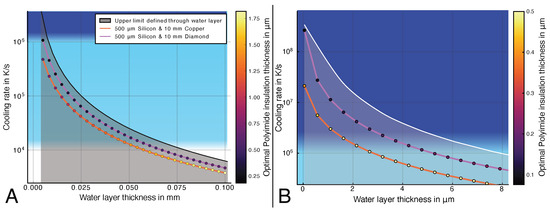 Both the numerical results of the domain model and the analytical representation of the cooling rate estimator (Appendix B, Equation (A23)) show that the cooling rate cannot exceed a given maximum by changing the insulation layer alone. If the time constant of the insulation layer is very small compared to the time constant of the water layer and the temperature difference in the insulation layer is sufficiently large, the dominating effect limiting the cooling rate is defined through the material properties of water. Therefore, maximizing is critical for attaining high cooling rates with the steady-state system. This is achieved by optimizing the design and the choice of materials. As the combined thickness of the silicon and the heat sink, , only influences through a logarithmic function, its effect is very diminished compared to their effective heat conductivity . Here, a 1000-fold value of does have a significantly stronger effect than a change in geometry. This effect can also be observed in Figure 8.