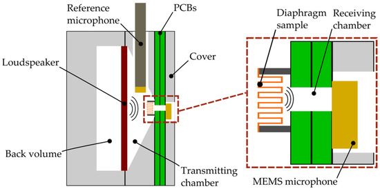 Figure 1 shows the realization of this measurement concept. The transmitting chamber is a conical volume inside an aluminum block. It contains an electrodynamic loudspeaker (GF0401M) from CUI Devices in Lake Oswego, OR, US and a ¼-inch pressure microphone set (46BP-1) from GRAS Sound & Vibration in Holte, Denmark with a flat frequency response up to 80 kHz [11]. A defined back volume is added to prevent external influences on the acoustic measurements and loudspeaker behavior. The diaphragm sample is glued to a carrier PCB with a hole for the sound port.