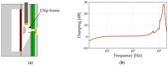 To reveal its influence on the acoustic signal caused by resonances or passively vibrating structures, the measurement setup is characterized in advance. Ensuring that only the diaphragm characteristics are measured, a chip frame without the diaphragm is mounted on the PCB as shown in Figure 2a. This configuration analyzes the total influences of all the elements expected to affect the diaphragm itself. Both microphones measure the pressure radiated from the reference loudspeaker.