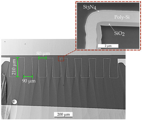 These acoustic experiments are carried out with folded MEMS diaphragms, which are mounted on carrier PCBs. Deep reactive ion etching (DRIE) of a 100-silicon wafer defines the folded structure of the diaphragm. Chemical vapor deposition (CVD) ensures a conformal coverage of the deep structures with the thin film stack of 400 nm SiO2, 1000 nm n-doped poly-crystalline silicon (Poly-Si), and 110 nm Si3N4 [4]. For these experiments, three samples each of 500 µm, 1000 µm, and 2000 µm long diaphragms with 210 µm deep structures are fabricated. The upper and lower bridges are 80 µm and 90 µm wide. Figure 3 shows a cross-section of such a diaphragm, imaged by scanning electron microscopy (SEM). The enlarged section proves that the diaphragm is completely released. This ensures that no residual silicon (Si) will affect the mechanical behavior and therefore the results of the subsequent measurements in this work.