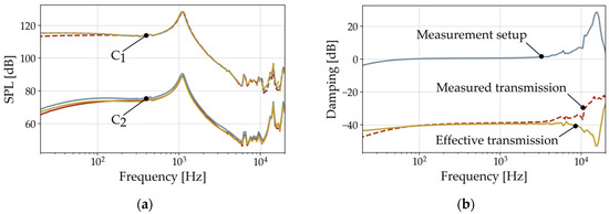 The loudspeaker in the transmitting chamber radiates the pressure Pin and the volume velocity qin. Accordingly, the folded diaphragm radiates Pout and qout into the receiving chamber. Fitting its value until the same simulated transmission characteristics are obtained between Pin and Pout determines Ca,Dia. Since the model represents only one sidewall of the transducer, it multiplies the radiated pressure by the total number of sidewalls, assuming a constant behavior along the diaphragm. Figure 6b shows a linear correlation between the fitted acoustic compliance and the resulting transmission characteristics. In the case of a 2000 µm long folded diaphragm, the transmission SPLC2–SPLC1 is a damping of −41 ± 0.9 dB. According to the LE model, this results in an acoustic compliance of m3/Pa.