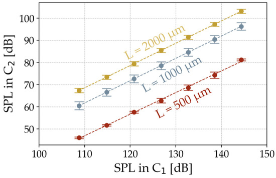 As mentioned above, LEM is used to extract mechanical parameters from the ATMs. A valid representation of the transducer requires its characteristic length scale being smaller than the wavelength of interest. In the case of the folded MEMS diaphragm, the 200 µm high sidewalls mainly define the mechanical behavior of the transducer. In the acoustic frequency range, wavelengths of interest are between 17.15 m and 17.15 · 10−3 m. This proves the validity of such a model for frequencies from 20 Hz to 20 kHz. A circuit with equivalent elements models the measurement setup, including the diaphragm sample, in the impedance analogy. As the LEM method is primarily used for linear behaving systems, the behavior of the folded diaphragm and the measurement setup are determined in advance with regard to their linearity. Figure 5 therefore shows the radiated SPL at 1 kHz for all diaphragm lengths for different SPLs radiated by the loudspeaker.