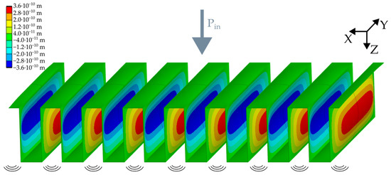 To validate the extracted values from the transmission measurements, finite element (FE) simulations are performed and compared with the LEM results. For this purpose, a three-dimensional model of the folded diaphragm is set up. In order to introduce the boundary conditions of the diaphragm clamping along the chip frame, the end faces are provided with a fixed support function in the y-direction. Only one lamella is meshed, whereas the others are mirrored via symmetry functions. The model applies a full surface pressure to one side of the diaphragm to simulate the input signal of the reference loudspeaker inside the transmission chamber. Figure 7 shows an example of the resulting lateral deflection of a 2000 µm long diaphragm along the x-axis of the diaphragm. For an acoustic input SPL of 94 dB, each vertical sidewall has a peak deflection of 0.33 nm for 500 µm and 0.36 nm for 1000 µm and 2000 µm long diaphragms. This causes a volume displacement in the receiving chamber.