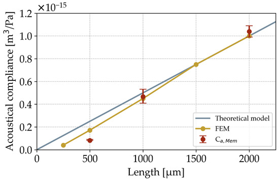 In order to extract their acoustic compliances, this work performs acoustic transmission measurements on the three-dimensional folded diaphragms shown in Figure 3. Three lengths of 500 µm, 1000 µm, and 2000 µm are fabricated with three samples each. For validation, each diaphragm geometry is numerically simulated using the model from Section 5. The resulting compliances for the three different diaphragm lengths are shown in Figure 8. Theoretically, the acoustic compliance of the diaphragm should increase linearly with its length and therefore its effective area. In comparison with the numerical model, this behavior is given for diaphragm lengths above 1500 µm. Below this, the compliance starts to decrease non-linearly. A similar behavior can be observed for the compliances extracted from the experimental setup. For the 1000 µm and 2000 µm long diaphragms, the measured results differ from the simulated values by only 3.7% and 4.0%. The shorter 500 µm diaphragm also shows that the simulated and measured acoustic compliance decreases non-linearly compared to the theoretical model. However, the extracted compliance from the measurements is almost half of that from the numerical simulations, meaning that the characterized samples transmit 6 dB less of the acoustic input signal than expected from the models.