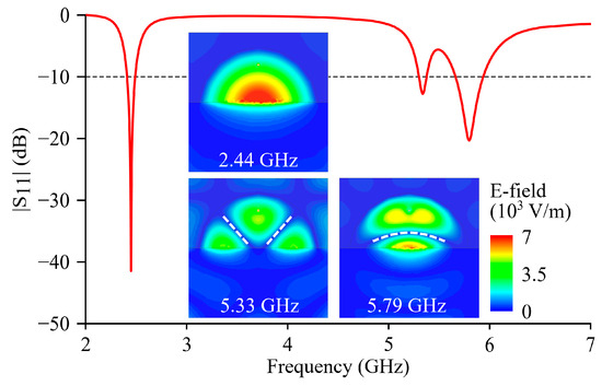 For Ant I, the return loss coefficient (|S11|) is simulated from 2 GHz to 7 GHz, and the simulated curve is shown in Figure 2. Three resonance frequencies fr1, fr2, and fr3 are observed from the simulated |S11| curve at 2.44, 5.33, and 5.79 GHz, respectively. The simulated −10 dB fractional bandwidths of Ant I at three resonance frequencies are 3.4%, 1.6%, and 5%, respectively. The relatively low bandwidths of Ant I mainly result from the use of low-loss materials [27], but the low losses also lead to a high radiation efficiency (≥95% in simulations).
