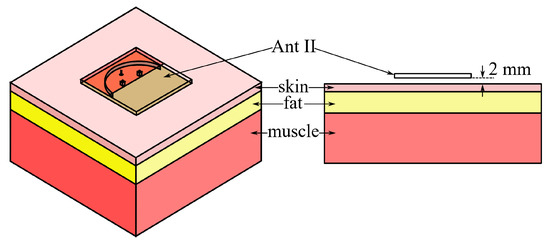 The performance of Ant II on the human body is investigated through simulations by using a 300 × 300 × 60 mm3 phantom model as shown in Figure 5. This phantom model consists of three layers of skin, fat, and muscle, and the employed relative permittivities, conductivities at 5.5 GHz and densities, as well as thicknesses of each layers in modelling are listed in Table 1 [24]. In simulations, the phantom model is located below the ground plane of Ant II with its center axis vertically coinciding with that of the antenna, and the distance between Ant II and the phantom model is selected to be 2 mm to imitate the practical wearable application where the antenna is attached to clothes worn on the human body.