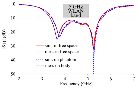 The return loss coefficients of Ant II in free space and on the phantom model are respectively simulated, and the simulated curves are shown in Figure 6. In free space, the simulated return loss is below −10 dB in 4.82~6.13 GHz (24% fraction bandwidth), which well covers the 5 GHz WLAN band (5.15~5.825 GHz), and the simulated fr1, fr2, and fr3 are 5, 5.65, and 5.95 GHz, respectively. It can be noticed from the simulated free-space curve that the notch at 5.65 GHz is not as deep as those at 5 and 5.95 GHz, but the corresponding return loss is still below −15 dB. On the phantom model, the simulated |S11| curve basically overlaps with the free-space counterpart with the same −10 dB impedance band and resonance frequencies. The simulation results indicate the robust frequency response characteristic of the proposed textile antenna against the influence of the human tissues.
