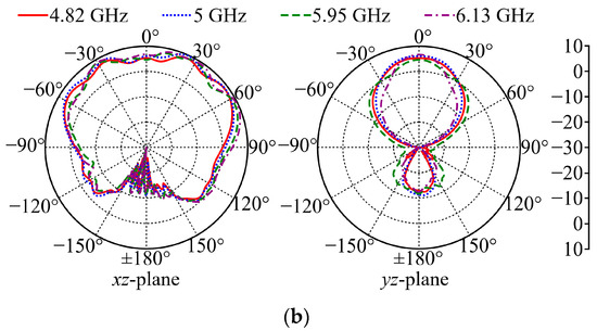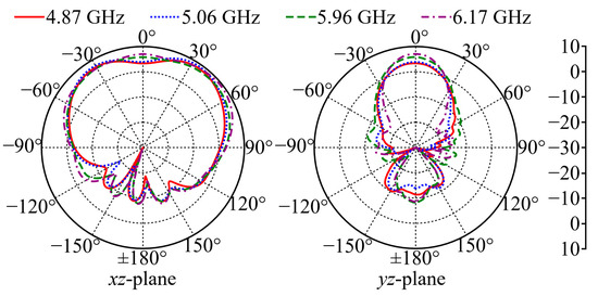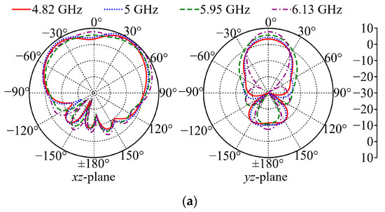 Figure 12 shows the measured free-space coplanar-polarized gain patterns at 4.87, 5.06, 5.96, and 6.17 GHz for Ant II. Although these measured investigated frequencies are slightly lower than the simulated results, the corresponding measured patterns show an agreement with the simulation results in Figure 7a, and the measured maximum co-polarized gains are 8.3, 9, 7.9, and 9.3 dBi at each frequency, respectively. Due to the limited equipment, ηrad and SAR are not practically measured in this work.