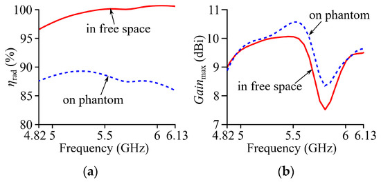 Figure 8 shows the simulated curves of the radiation efficiency ηrad and maximum gain Gainmax of Ant II with respect to frequency within its −10 dB impedance band. The simulated ηrad and Gainmax of the proposed antenna in free space are, respectively, above 97% and 7.6 dBi. On the phantom model, the simulated ηrad is lower than the free-space scenario because of the absorption of radiation in the phantom model, but is still above 86%. On the other hand, the simulated Gainmax of Ant II on the phantom model is higher than the free-space counterpart due to the reflected backward radiation on the phantom model.