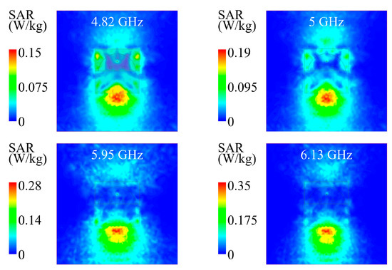 The 1 g average SAR in the phantom model is simulated for Ant II with a 0.5 W input power, and obtained SAR distributions at 4.82, 5, 5.95, and 6.13 GHz are shown in Figure 9. At each frequency, the simulated maximum SARs are respectively 0.15, 0.19, 0.28, and 0.35 W/kg, which are much lower than the safety limits specified by IEEE C95.1-2005 (≤1.6 W/kg) [28] and EN 50361-2001 (≤2.0 W/kg) [29]. Therefore, it is compelling that the designed ground plane of Ant II can provide sufficient electromagnetic isolation, which effectively presents severe electromagnetic damage in the human tissue from the antenna radiation.
