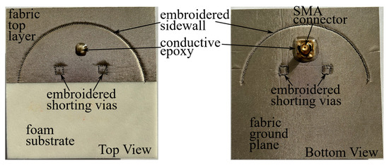 A textile prototype of Ant II is practically fabricated with the mentioned materials and computerized embroidery, and photos of it are shown in Figure 10. Conductive epoxy CW2460 is employed for the electrical connection and physical bonding at the feeding probe. Because of the used textile and foam materials, the fabricated antenna prototype is highly flexible.