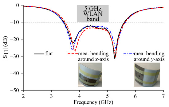 Measurements are carried out on the prototype bending along a cylindrical surface with an 8 cm radius to imitate the practical situation where the antenna is located on the shoulder or limbs of the wearer, and the measured |S11| curves are shown in Figure 11. With bending conditions around the x-axis or y-axis, the observed shift in the resonance frequencies does not necessarily lead to a notable deterioration in the antenna’s performance. This therefore indicates the robust frequency characteristic of Ant II against physical deformations in practical wearable applications.