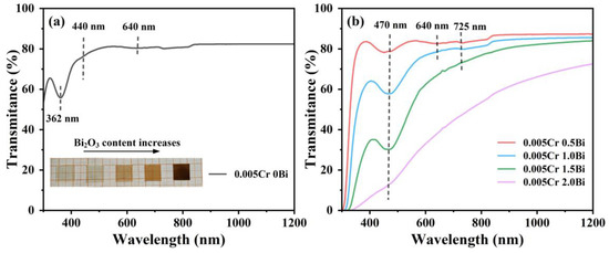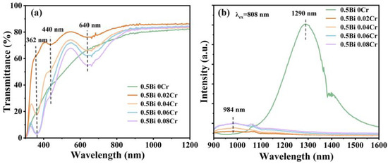Figure 1a shows the transmittance spectra for 0.5Bi2O3−xCr2O3 (x = 0, 0.02, 0.04, 0.06, 0.08) glass samples. Three absorption peaks at ~362, ~440 and 640 nm are noticed in the visible range. According to previous studies, the absorption bands at 362 nm are assigned to the 4A2 → 2A1 transition of Cr6+, while the peaks at 440 and 640 nm are contributed by the 4A2 → 4T1 and 4A2 → 4T2 transitions of Cr3+ [27,28,29]. With the increasing concentration of Cr2O3, the absorbance at 362 nm, 440 nm, and 640 nm gradually increases. Notably, no significant Bi-related characteristic absorption peaks are detected in Figure 1a, suggesting a limited presence of Bi NIR emission centers in the glass samples.