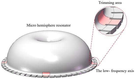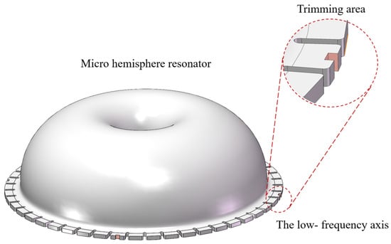 7]. Frequency split can be reduced by trimming the local stiffness of the resonator through electrostatic trimming. This method, with its advantages of precise control, non-contact operation, and high flexibility, is commonly employed in microelectromechanical systems (MEMS) gyroscopes. Mechanical trimming involves the removal of material mass, permanently trimming the structural mass. This method enables frequency trimming over a wide bandwidth range without relying on high-voltage closed-loop control. Due to their small size, the micro-hemispherical resonators are typically trimmed by mass removal.
