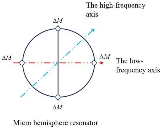 23], frequency split in micro-hemispherical resonators can be reduced by removing mass at the four low-frequency axis, as illustrated in