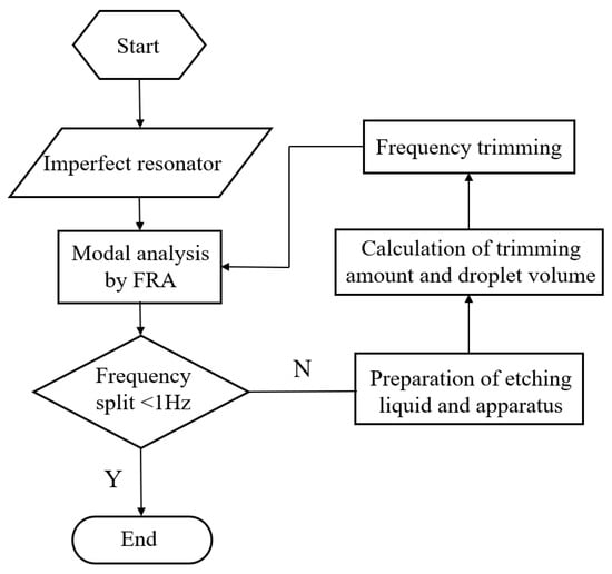 Figure 12 was obtained. Initially, the low-frequency axis position of the resonator was tested using frequency response analyzer (FRA) and marked. Next, the etching solution and apparatus are prepared. The trimming amount and droplet volume are calculated based on the frequency split, and the etching height