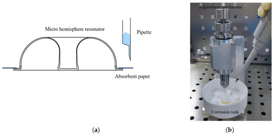 Figure 13a features a schematic diagram of the experiment, where indirect contact is made between the micro-hemispherical resonator and the etching liquid. This contact leads to the spreading of the etching liquid over the surface of the shell, potentially corroding up to half of the shell. To mitigate this, absorbent paper is placed on the teeth of the resonator’s low-frequency axis. The etching liquid is then deposited onto the absorbent paper using a pipette. This indirect method of application restricts the spread of the etching liquid, enabling more precise adjustment of the trimming location.