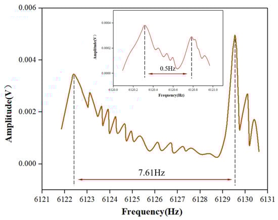 The frequency split of the resonators ultimately reached 0.7 Hz, 0.5 Hz, and 0.8 Hz. The test results for H02, with the smallest frequency split after trimming, are shown in