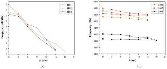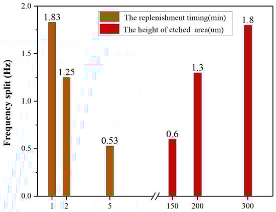 , a continuous decrease in the frequency split is observed, while the low-frequency experiences a significant increase and the high-frequency undergoes a slight change. This indicates that a distinct mass removal trimming effect is achieved with minimal impact on stiffness.When the etching solution is applied only to the resonator’s teeth-like tines, the trimming process decouples stiffness and mass, and it results in mass trimming.